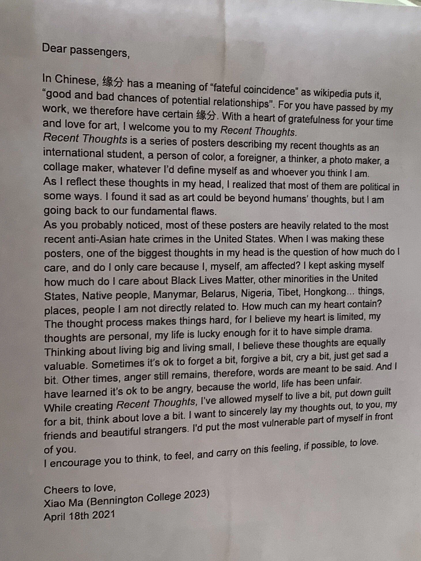 After the first round exhibition in April, I received a lot of feedback, then multiple other things happened. I went between the question of what’s reality and what’s conceptual again. Planning on the road trip, driving down from Vermont, bringing down all these posters, seeing them crashed, smudged, folded, unfolded, slowly got lost at the bottom of the car seat. They are just pieces of paper after all, the fragility of materials is real. Practicality resembles parts of reality, the reality is roadtrip is hard, planning is annoying, and what’s harder is the uncertainty of being in such limbo space. I got into an accident a few days ago, my car was totaled, the posters are still here, safe and sound. Reality doesn't teach us to prioritize the value of non-profited works. However, exhibitions are just like road tripping, hard to plan, and the liminal space is scary.Even though not everyone will understand, every exhibition comes with unexpected results, I once heard something very important from a documentary: art is not the object that’s presented, instead, art happens between the audiences and the work itself.